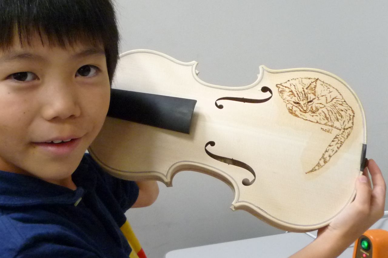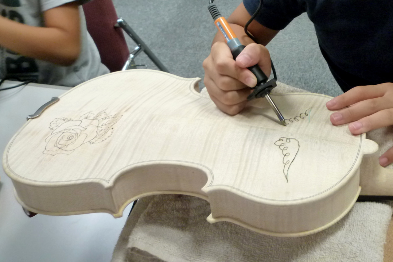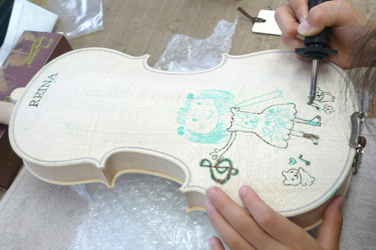 電熱ペンを使ってバイオリンにお好きなイラストやご自分の名前を描き入れていきます。 少しドキドキしますがとても楽しい体験です。世界で一つの作品を作り上げましょう。