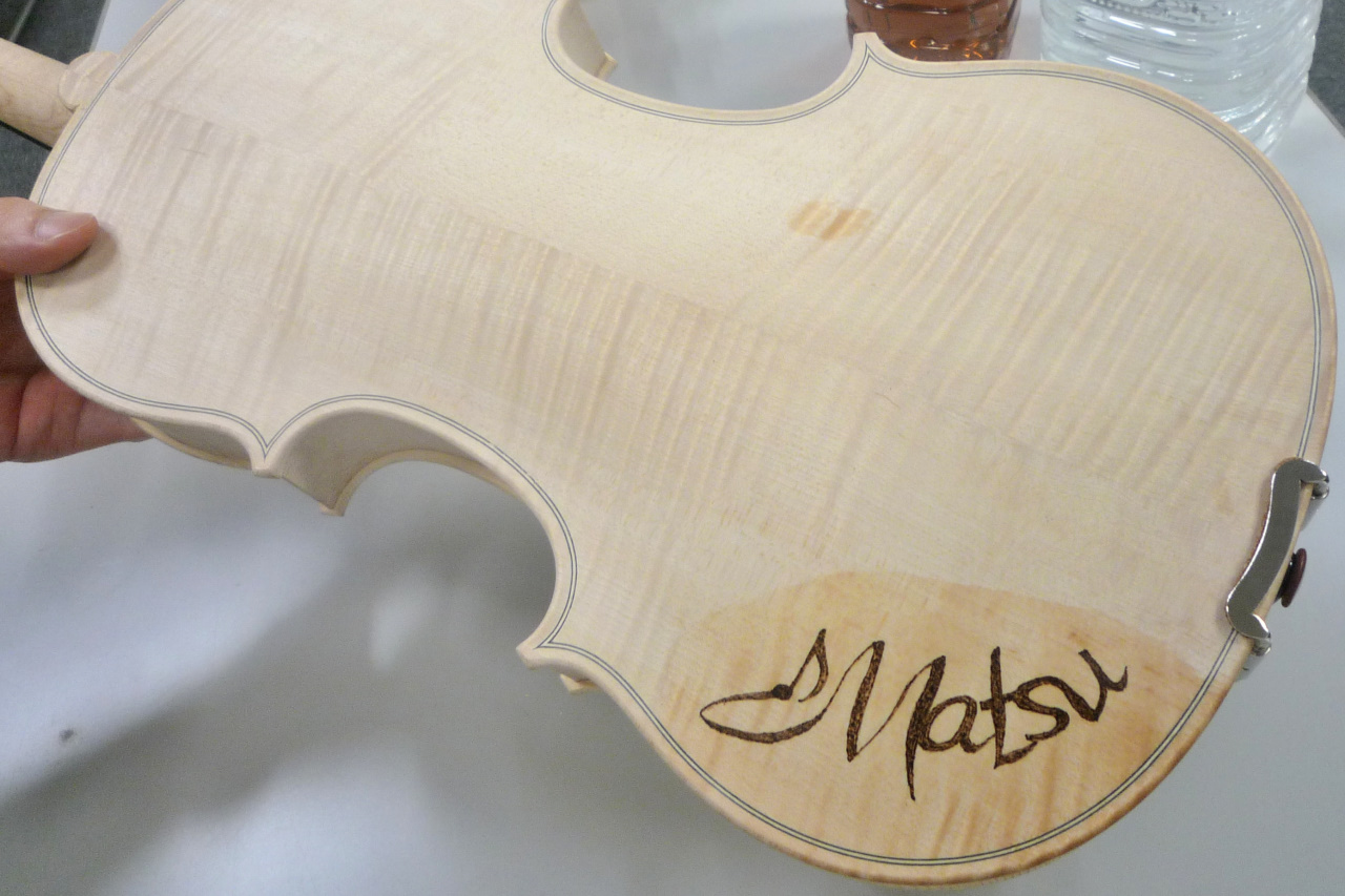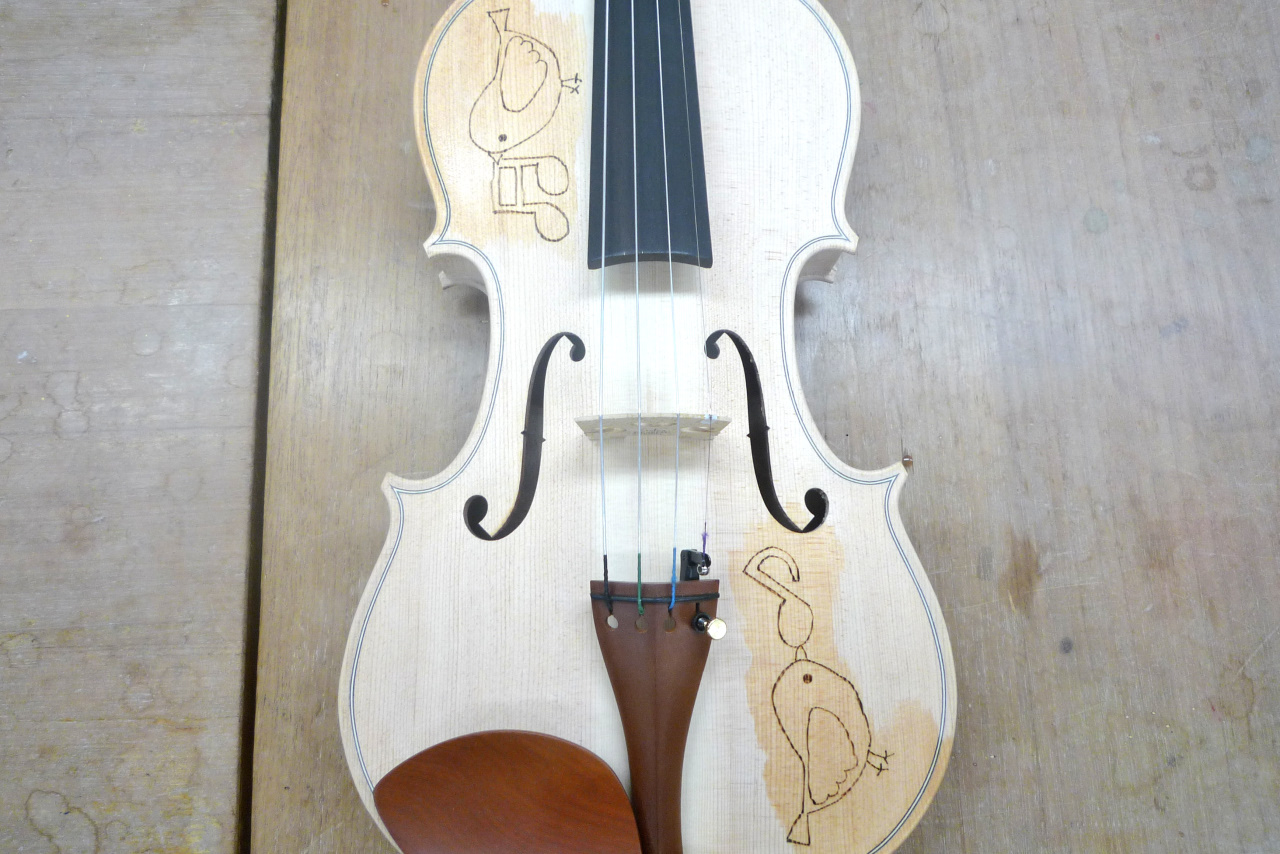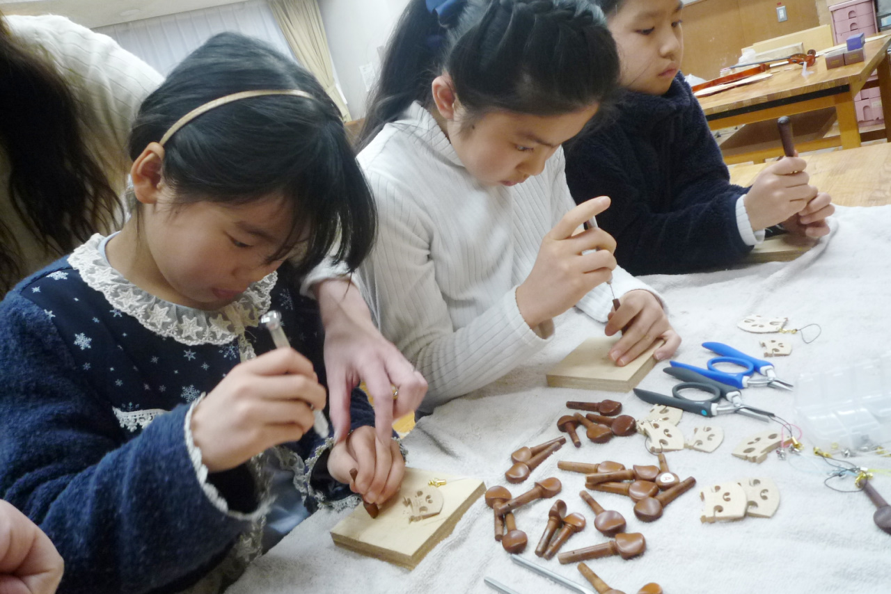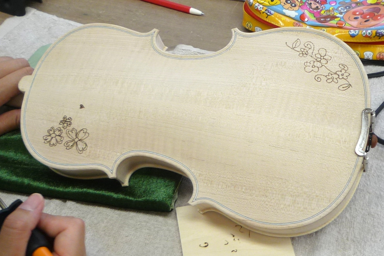 電熱ペンを使ってバイオリンにお好きなイラストやご自分の名前を描き入れていきます。 少しドキドキしますがとても楽しい体験です。世界で一つの作品を作り上げましょう。