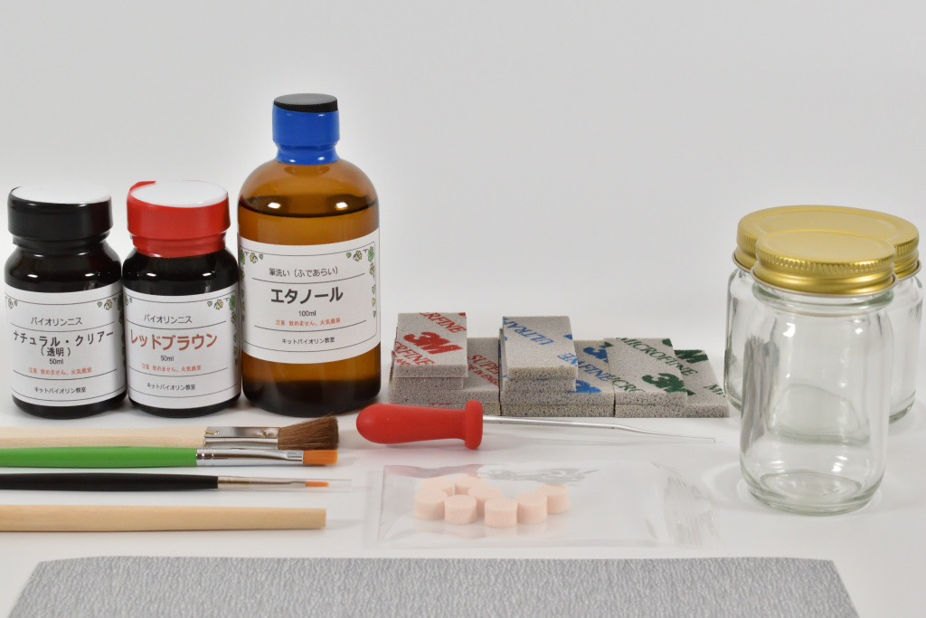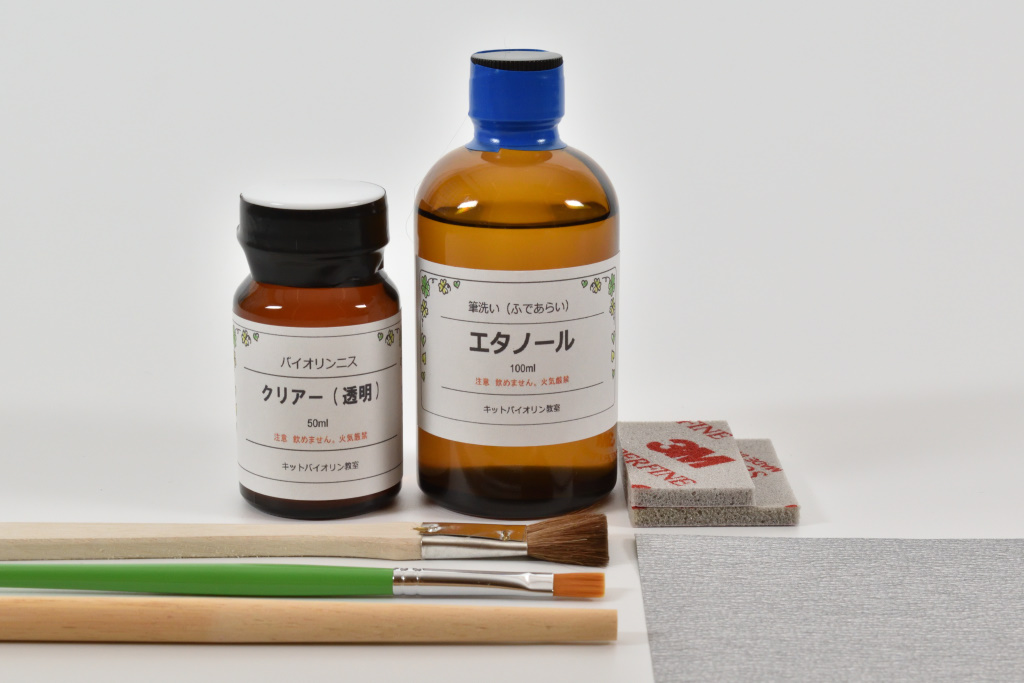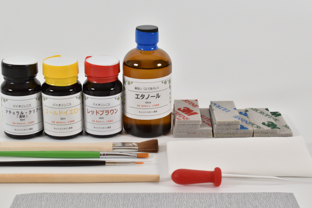 楽器専用ニスに加えて筆や道具などの一式がセットになっています。